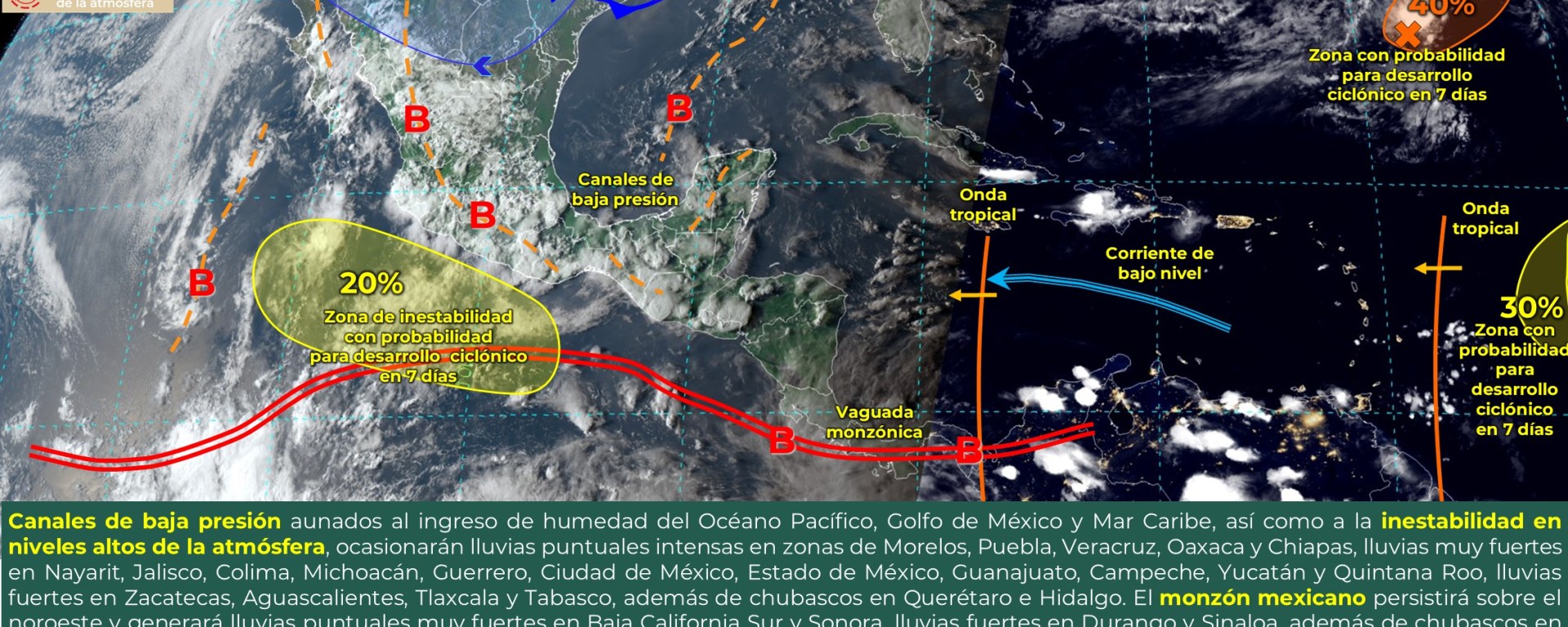 Intervalos de chubascos con lluvias puntuales fuertes (25 a 50 mm): Chihuahua, Durango, Zacatecas, Nayarit, Jalisco, Colima, Guanajuato, Estado de México, Ciudad de México, Morelos, Tlaxcala, Puebla, Veracruz, Tabasco y Campeche.