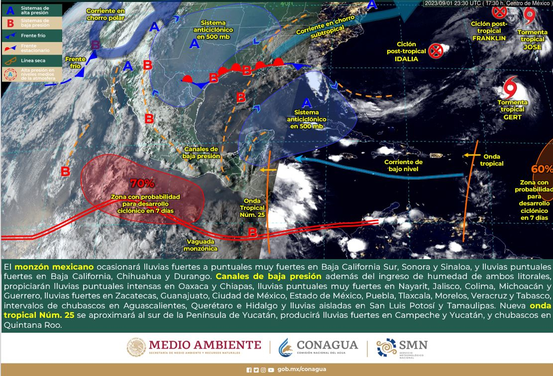 Intervalos de chubascos con lluvias puntuales fuertes (25 a 50 mm): Sonora, Chihuahua, Nayarit, Jalisco, Colima, Michoacán, Guerrero, Estado de México, Morelos, Puebla, Campeche, Yucatán y Quintana Roo.