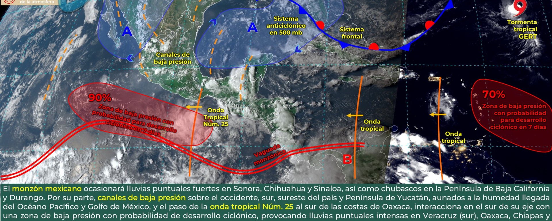 Intervalos de chubascos con lluvias puntuales fuertes (25 a 50 mm): Nayarit, Estado de México, Ciudad de México, Tlaxcala, Morelos, Tabasco, Campeche, Yucatán y Quintana Roo.