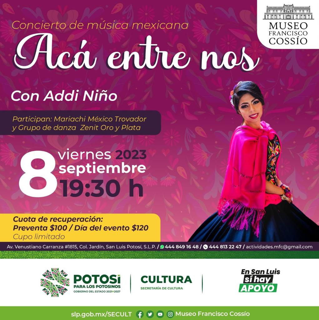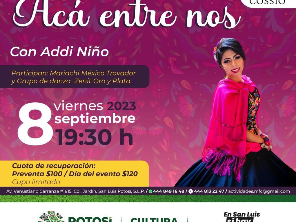 En San Luis Potosí si hay apoyo en cultura, y para comenzar las actividades de las fiestas patrias la Secretaría de Cultura de Gobierno del Estado, invita al público en general al concierto Acá entre Nos» que ofrecerá Addi Niño en el Museo Francisco Cossío este próximo viernes 8 de septiembre a las 19:30 h, acompañada por el Mariachi México Trovador y el grupo de danza folclórica Zenit Oro y Plata.