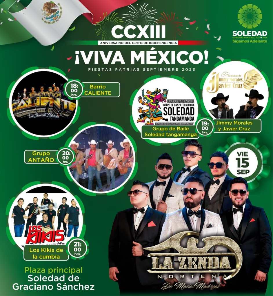 La variedad para este próximo día de fiesta dará inicio a las 18:00 horas, en la plaza principal, con la presentación del grupo de música colombiana “Barrio Caliente”; seguido de la presentación del grupo de baile “Soledad Tangamanga”; Jimmy Morales y Javier Cruz brindarán entretenimiento con su estilo a las 19:00 horas. El grupo de música norteña “Antaño” se presentará a las 20:00 horas, para dar paso a Los Kikis de la Cumbia que pondrán a bailar a la ciudadanía en punto de las 21:00 horas, externó por otra parte el titular de Cultura, Roberto Posadas Martínez.