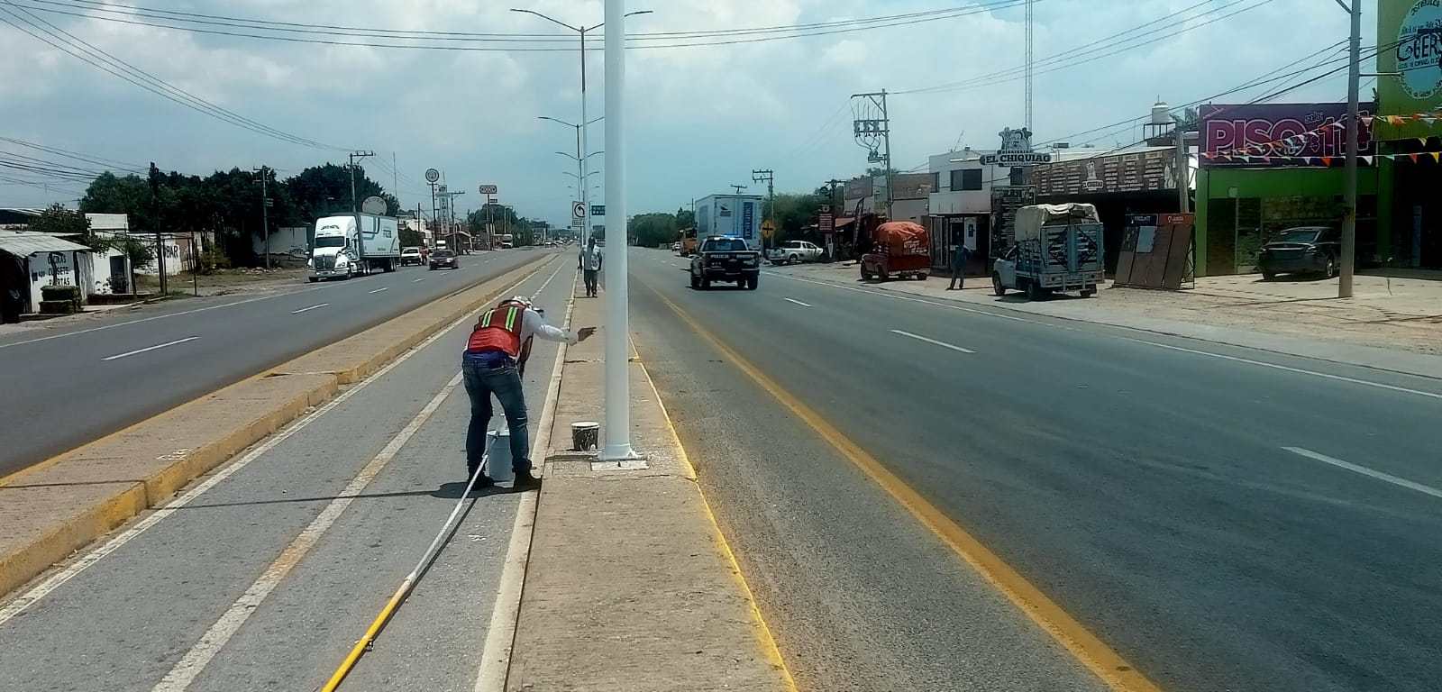 La Junta Estatal de Caminos aplica pintura en los postes de alumbrado público instalados en carretera a Zacatecas