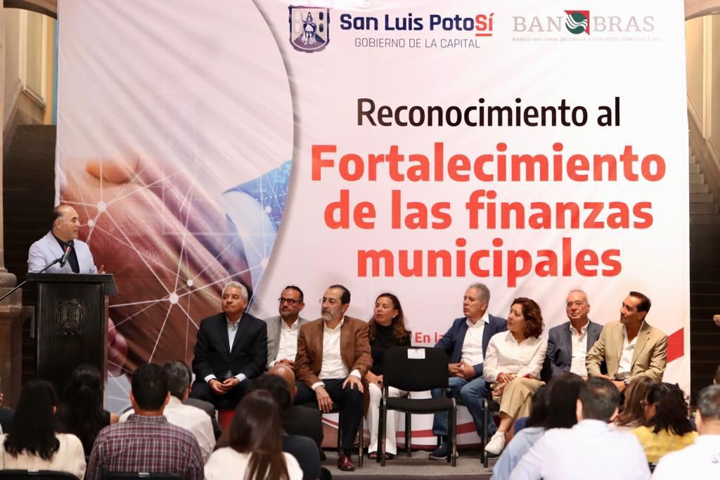 Por haber fortalecido significativamente sus finanzas municipales, al eficientar sus procesos de aplicación del impuesto predial e incrementar la recaudación en más de 40 por ciento en este 2023, el Banco Nacional de Obras y Servicios (Banobras), a través de Antonio García Carreño, Titular de la Unidad de Financiamiento y Asistencia Técnica a Gobiernos, entregó este jueves un reconocimiento al Gobierno de la Capital, encabezado por el Alcalde Enrique Galindo Ceballos, quien expresó recibirlo “con mucho orgullo, porque es la expresión de una institución federal que dice la ciudad de San Luis Potosí está haciendo bien las cosas. Por los logros obtenidos en la recaudación del impuesto predial, del Impuesto Sobre Adquisición de Inmuebles y de Traslado de Dominio, con apoyo de Banobras, en más del 40 por ciento.