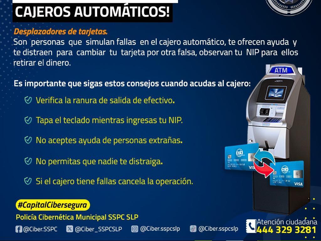 En las redes sociales de la Secretaría de Seguridad y Protección Ciudadana así como de la Policía Cibernética Municipal se estarán emitiendo mensajes para prevenir esta modalidad delictiva y a la par, a través de las áreas operativas de Guardia Municipal, Policía Vial y Tecnologías en Inteligencia Social se estará reforzando la presencia preventiva en cajeros automáticos de la Capital potosina.