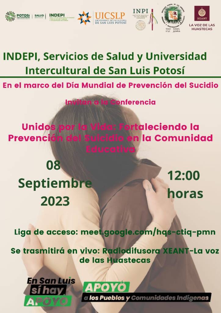 El Gobierno de San Luis Potosí brinda apoyo en acciones preventivas y de atención a la salud mental, por lo que este viernes 8 de septiembre, a las 12:00 horas, realizará la conferencia “Unidos por la vida”, dirigida a jóvenes de 23 municipios con población indígena, como parte de las actividades por el Día Mundial para la Prevención del Suicidio en Comunidades Indígenas que se conmemora cada 10 de septiembre.