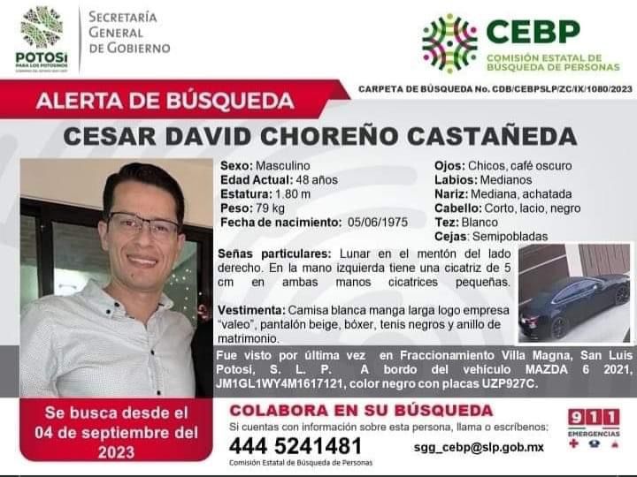 César es un ejecutivo de la empresa Valeo aquí en San Luis Potosí, según información de su familia, fue secuestrado y visto por última vez en Villa Magna a bordo de su vehículo Mazda 6 con placas UZP927C, el 4 de septiembre.