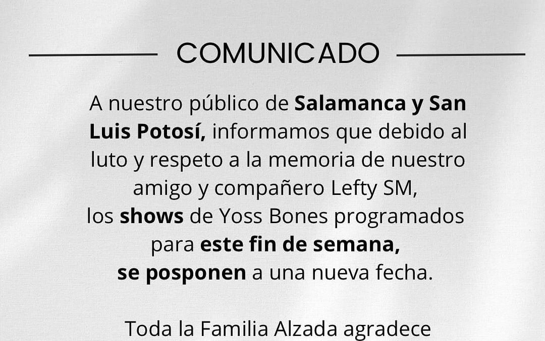 La artista anunció que, como una muestra de respeto ante el fallecimiento de su amigo y colaborador Lefty Sm, se pospone la fecha del concierto gratuito que se llevaría a cabo en las Instalaciones del Instituto Potosino de la Juventud
