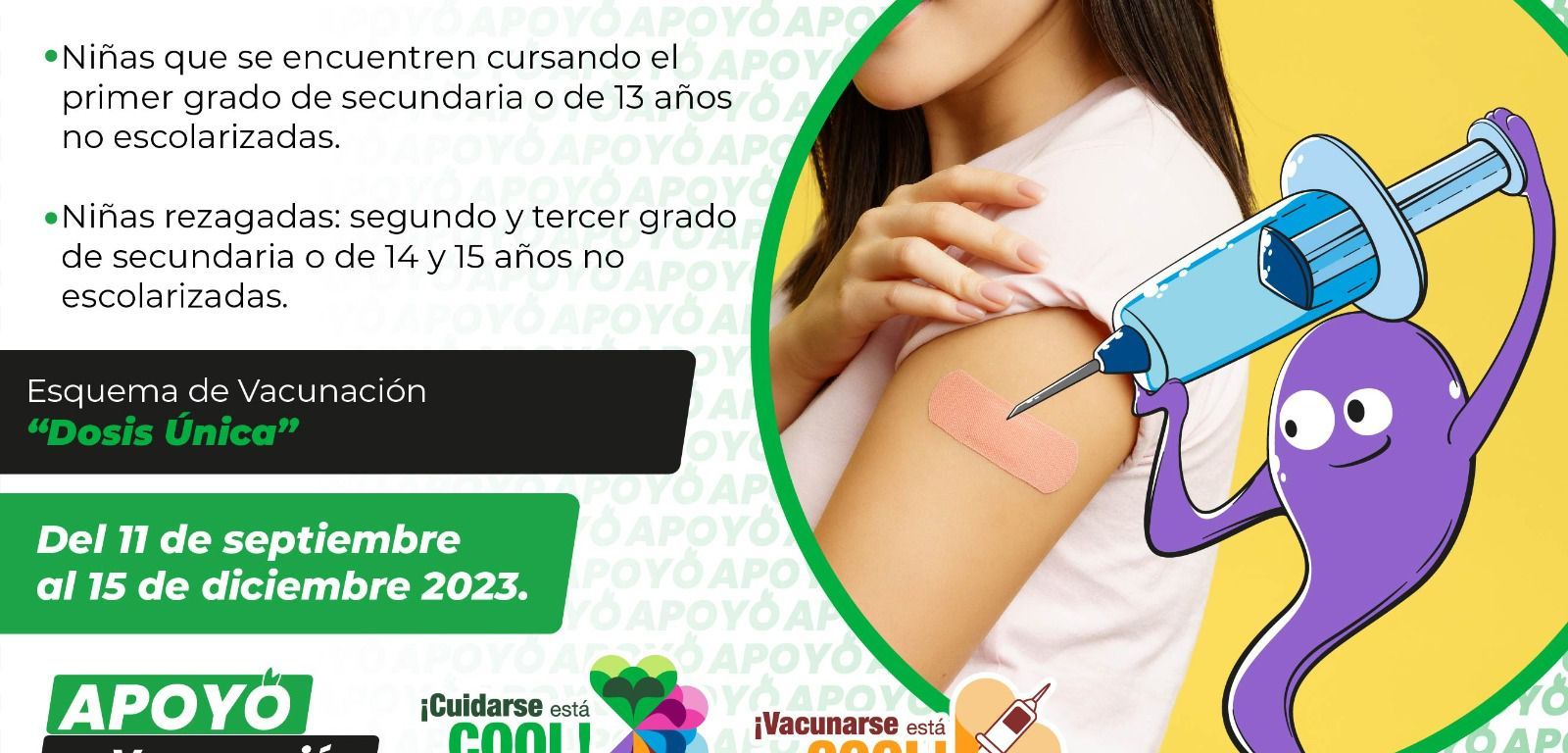 La vacunación se estará realizando del 11 de septiembre hasta el 15 de diciembre en escuelas primarias y secundarias de todo el estado, así como en Centros de Salud a niñas de 11, 12, 13, 14 y 15 años no escolarizadas, y también a mujeres y mujeres trans de 11 a 49 años que viven con VIH/Sida.