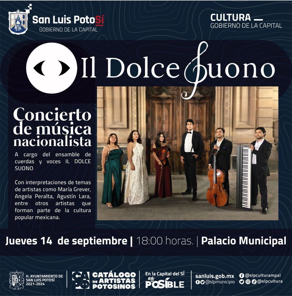 Para el jueves 14 de septiembre a las 6 de la tarde, en Palacio Municipal se realiza el “Concierto de Música Nacionalista”, con la agrupación Il Dolce Buono, que interpretarán música de María Greever, Ángela Peralta, Agustín Lara y otros más.