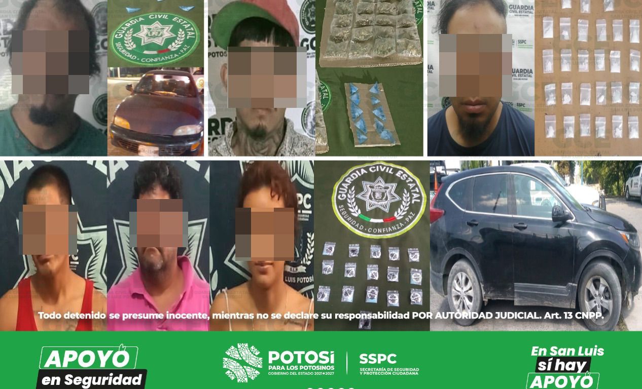 Labores de inteligencia efectuadas dentro del Plan Integral de Seguridad, permitieron la detención de seis probables narcomenudistas en diferentes puntos de la entidad potosina. Agentes de Guardia Civil Estatal (GCE) aseguraron 78 dosis de estupefacientes.