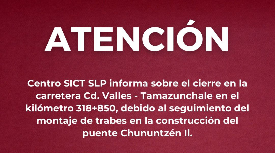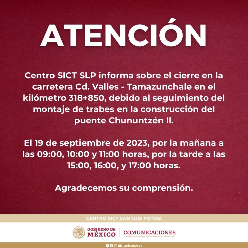 La Secretaría de Infraestructura, Comunicaciones y Transportes (SICT) en San Luis Potosí informa que se llevarán a cabo cierres parciales en el kilómetro 318+850 de la carretera Ciudad Valles-Tamazunchale, con el propósito de dar continuidad a la construcción del puente ChununtzénII.