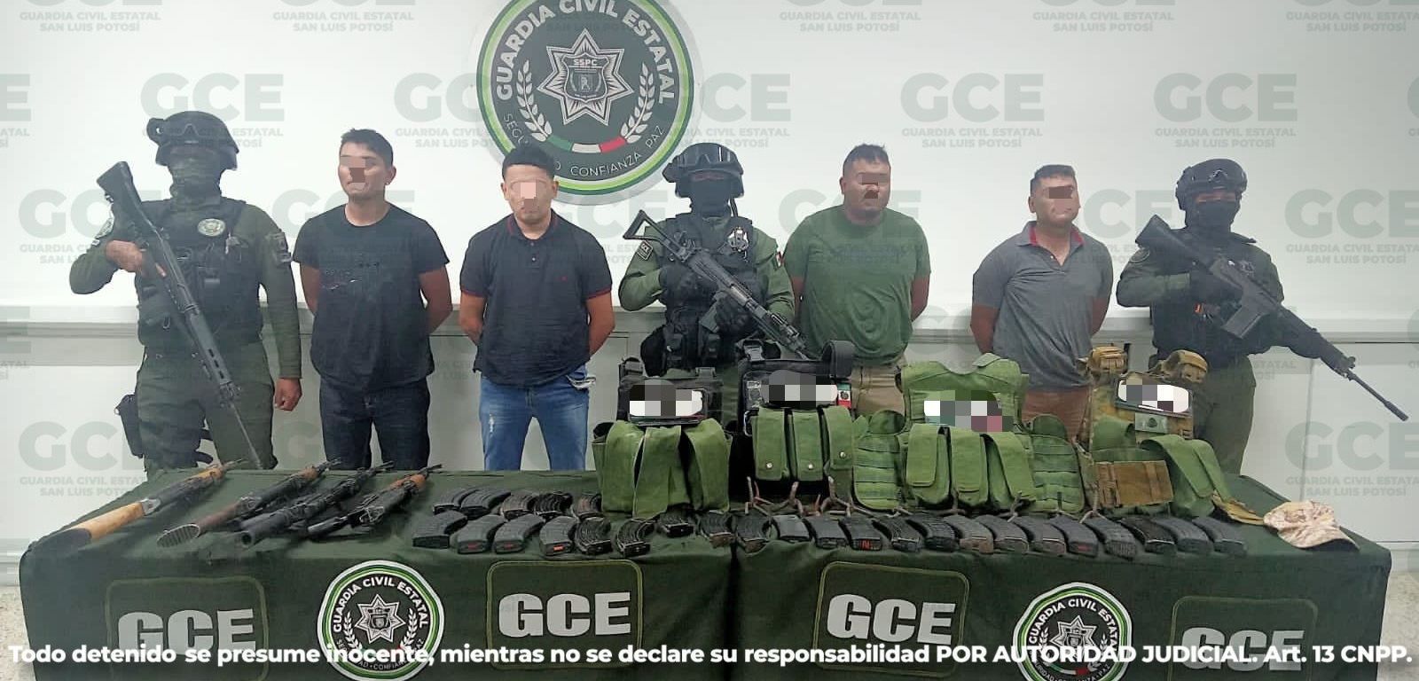 se procedió a la detención de Fabian N. de 40 años de edad, Félix N. de 40 años de edad, Eitan N. de 21 años de edad y Ramiro N. de 20 de edad. (Los tres primeros son originarios del Estado de Jalisco, el último es originario de Cárdenas, S.L.P.)