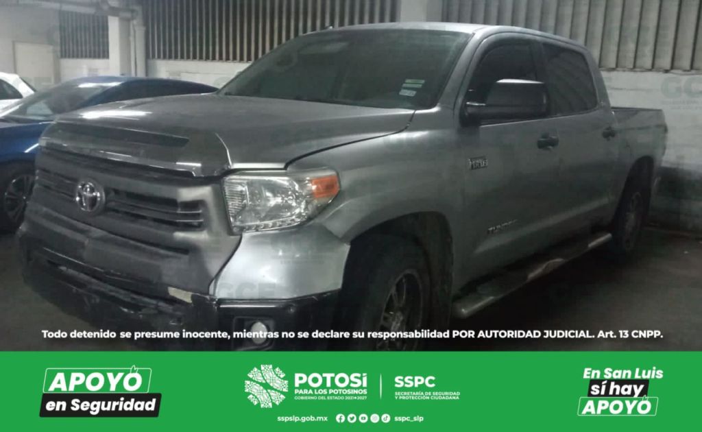 El vehículo asegurado es marca Toyota, tipo Tundra, modelo 2014, sin placas de circulación de procedencia extranjera, cuenta con reporte de robo con violencia del 29/06/2023 en Carretera Federal 80 Ciudad Mante – El Huizache, km 30, Comunidad Presa de Guadalupe, Guadalcázar, S.L.P.