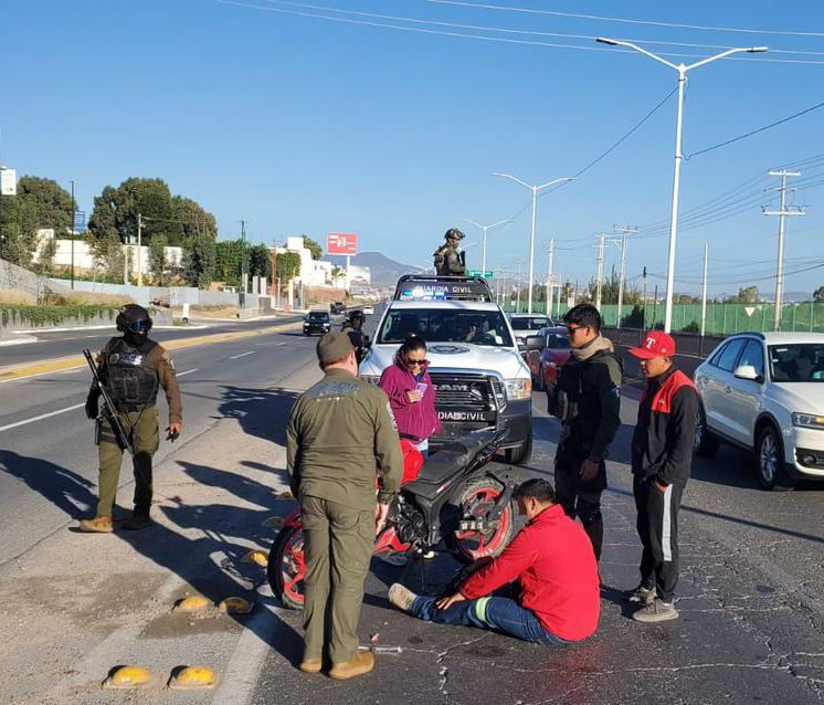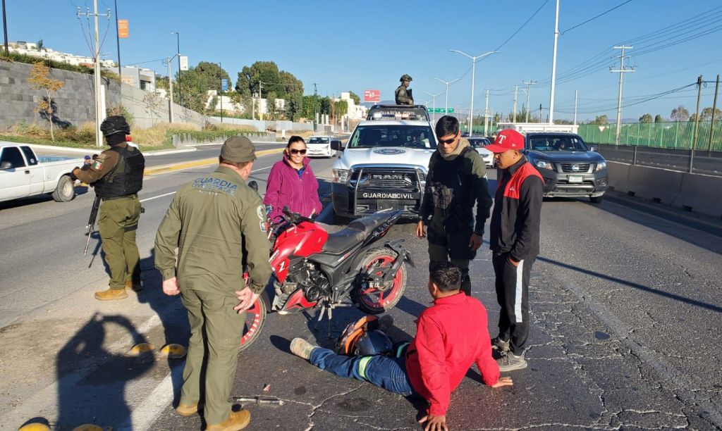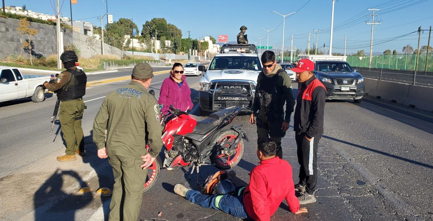 Esta mañana, luego de registrarse un percance vial frente a una plaza comercial de Circuito Potosí, oficiales de la Guardia Civil Estatal San Luis Potosí, acudieron para realizar tareas de abanderamiento y prestar los primeros auxilios a un masculino que presentó golpes menores.
