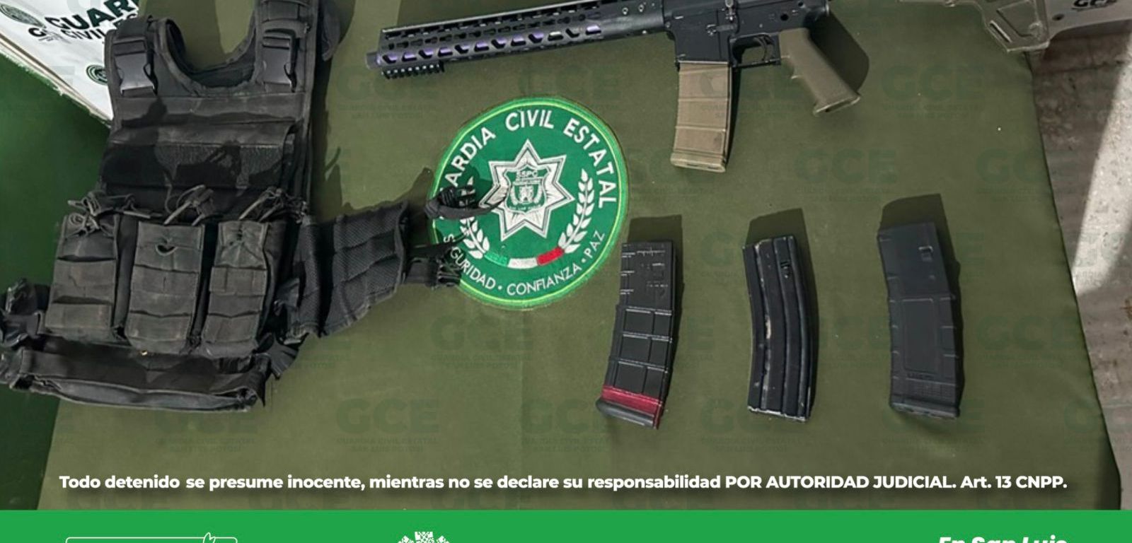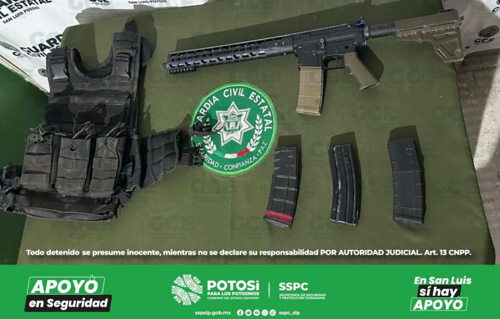 Como resultado de las acciones operativas desplegadas en el dispositivo “Altiplano Seguro”, oficiales de la Guardia Civil Estatal (GCE) aseguraron una camioneta que tenía reporte de robo y en su interior había un fusil de asalto, cartuchos útiles y un chaleco táctico.