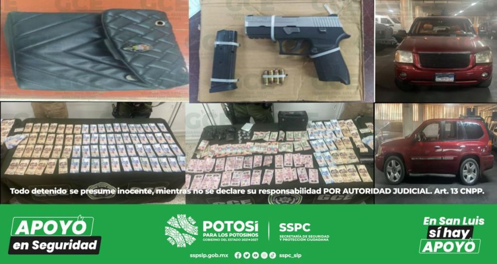 Además, se les encontró un arma de fuego calibre 9 milímetros, un cargador, cuatro cartuchos útiles, cinco bolsas con marihuana, diez dosis de “cristal” y el vehículo GMC Envoy color rojo modelo 2002, lo cual fue puesto a disposición de las autoridades competentes.