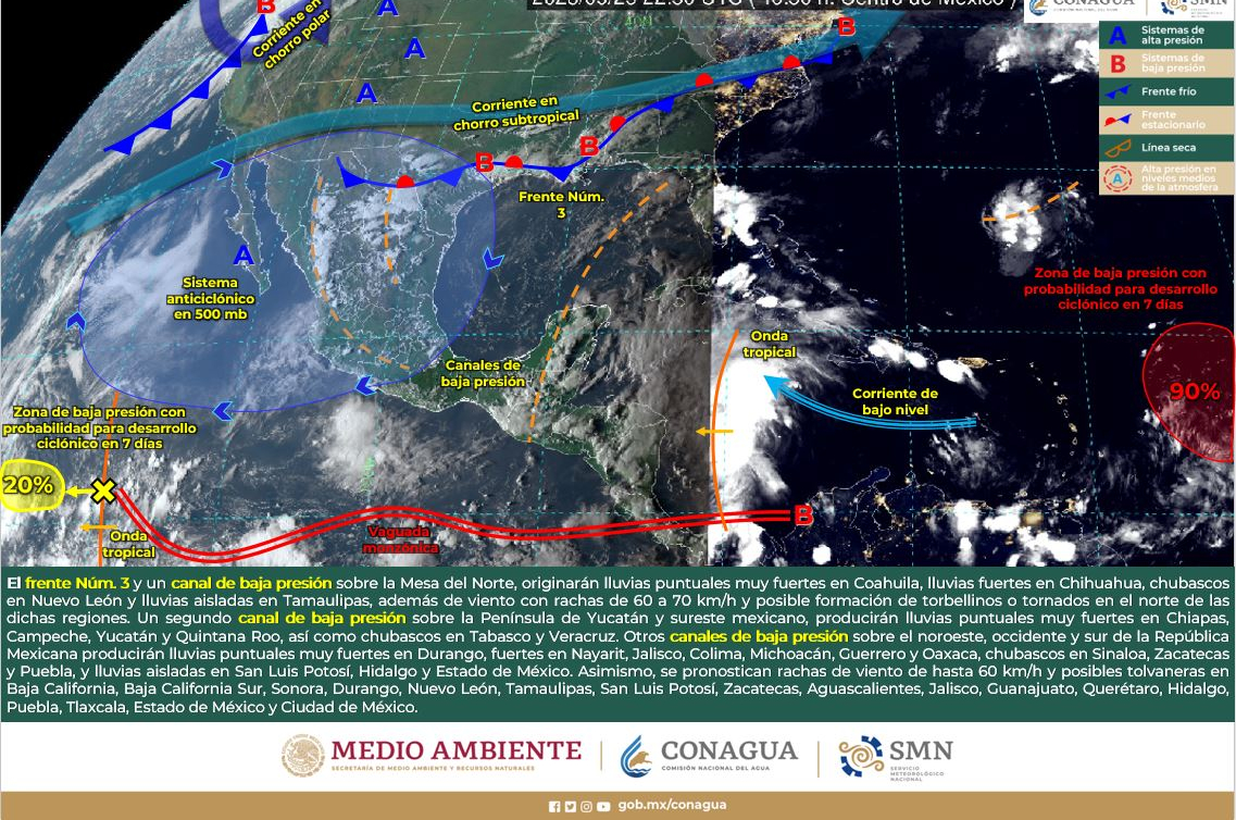 Viento con rachas de 40 a 60 km/h: Istmo de Tehuantepec, y con posibles tolvaneras: Baja California, Baja California Sur, Sonora, Durango, Nuevo León, Tamaulipas, San Luis Potosí, Zacatecas, Aguascalientes, Jalisco, Guanajuato, Querétaro, Hidalgo, Puebla, Tlaxcala, Estado de México y Ciudad de México.