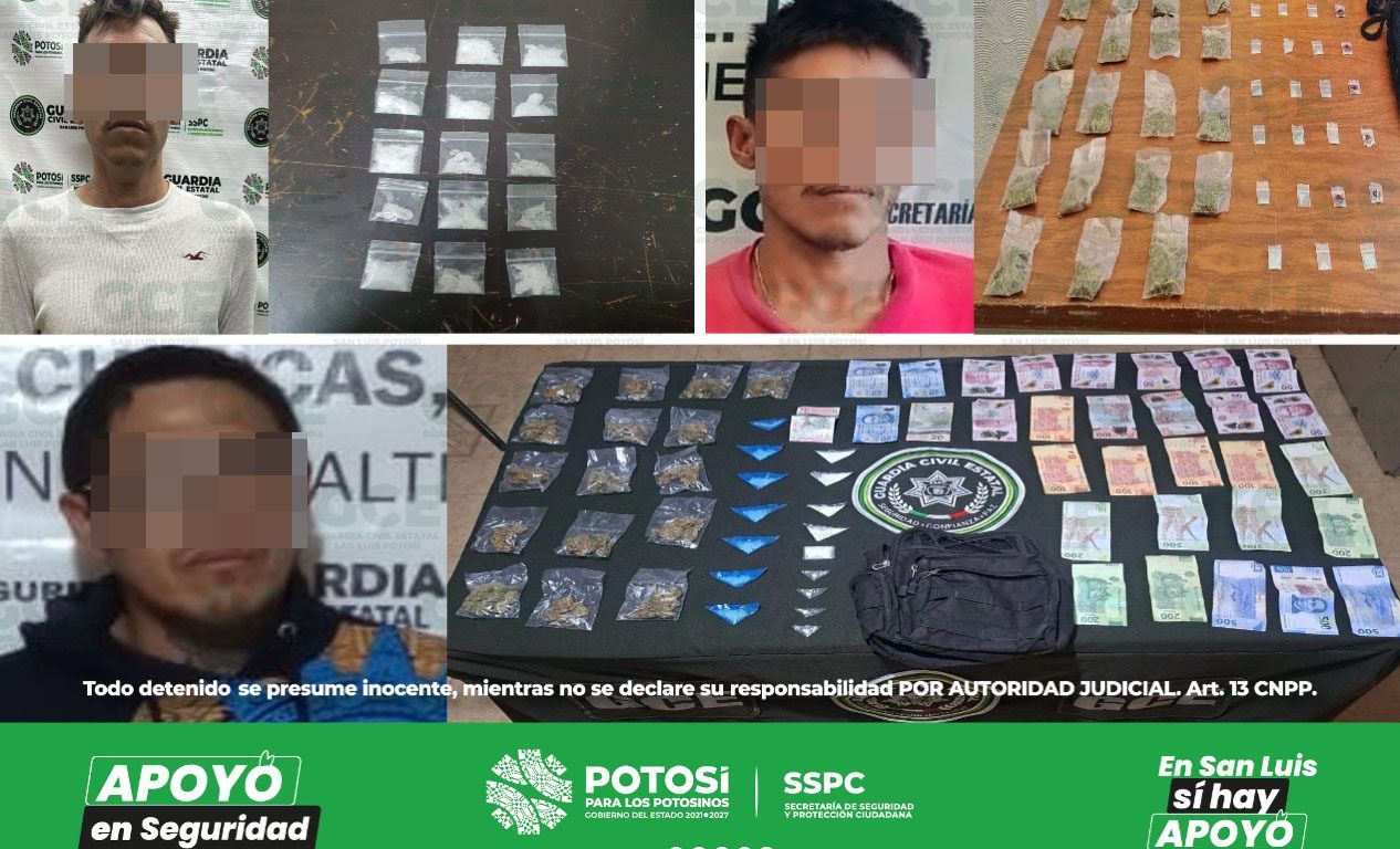 Como resultado de la reacción inmediata a situaciones que ponen en riesgo la paz y la salud de la ciudadanía potosina, agentes de la Guardia Civil Estatal (GCE) detuvieron a tres probables narcomenudistas, en diferentes hechos, a quienes se les aseguraron 88 dosis de droga.