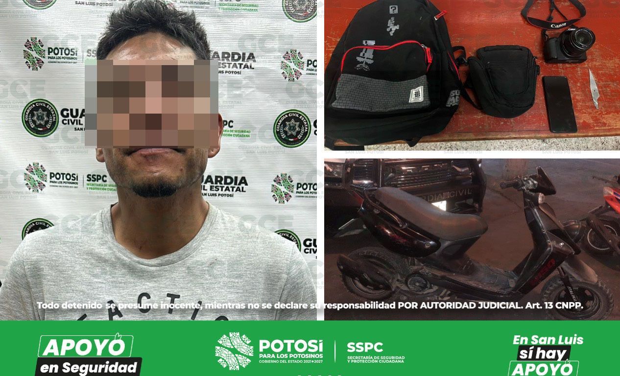 El actuar oportuno de la Guardia Civil Estatal (GCE) ante una alerta sobre un probable robo en proceso a una vivienda, permitió la detención del probable responsable de dichos actos; pretendía huir con objetos diversos, entre ellos una cámara fotográfica.
