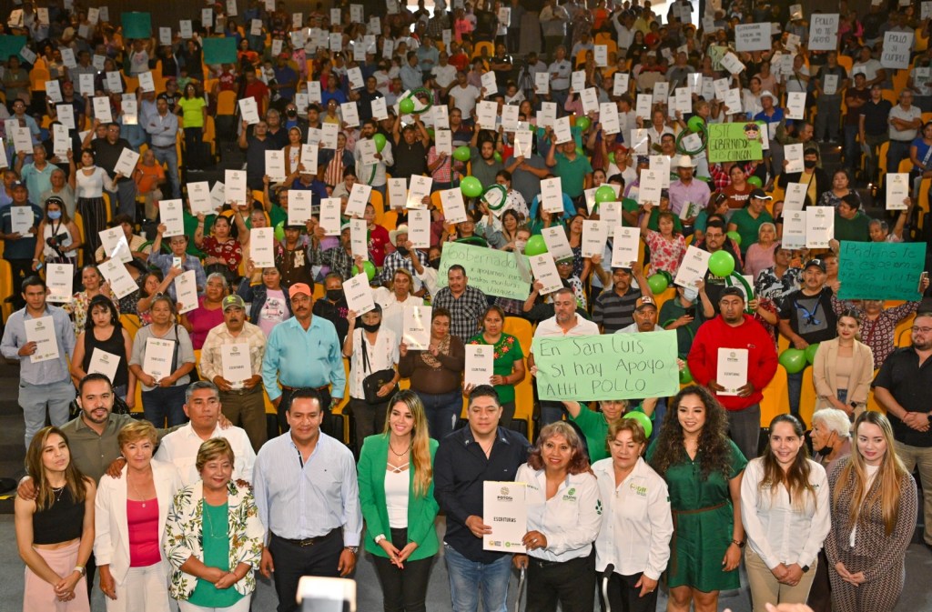 Agradeció a los notarios que agilizaron los trámites y a la presidenta municipal, Leonor Noyola, por su apoyo para la regularización; invitó a las familias a celebrar porque cuentan con la certeza jurídica de sus propiedades, para heredar a sus descendientes y la seguridad de que nadie podrá quitárselas.