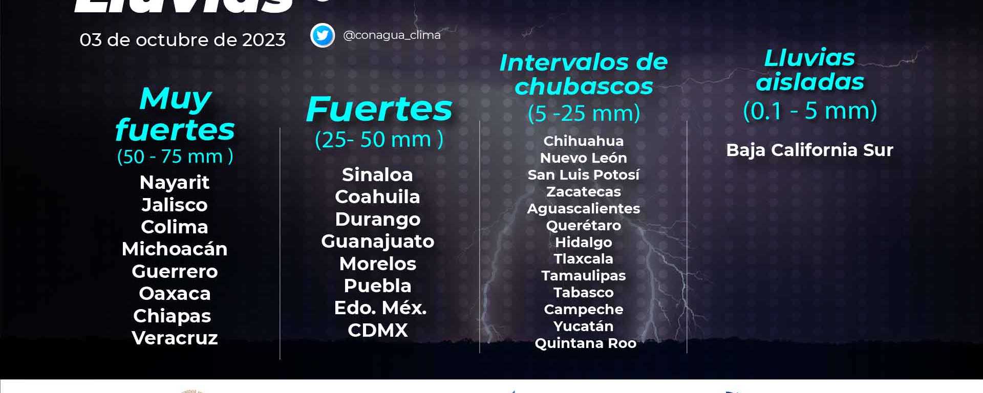 Intervalos de chubascos (5 a 25 mm): Chihuahua, Nuevo León, San Luis Potosí, Zacatecas, Aguascalientes, Querétaro, Hidalgo, Tlaxcala, Tamaulipas, Tabasco, Campeche, Yucatán y Quintana Roo.