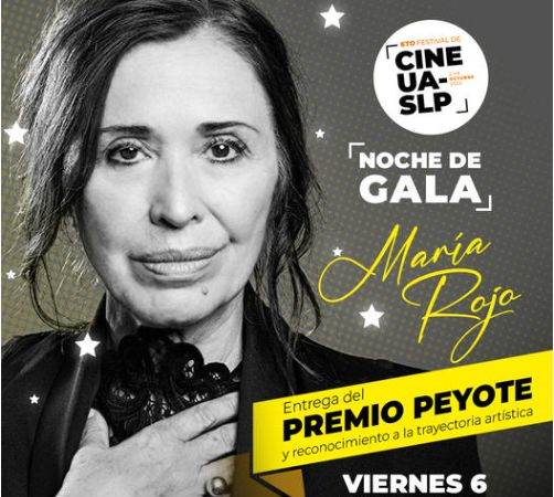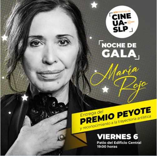 En el marco del cierre del 6to Festival de Cine de la UASLP este viernes 06 de octubre se vivirá una noche de gala en el Patio del Edificio Central, cuando el rector, doctor Alejandro Zermeño Guerra, realice la entrega del “Premio Peyote”, a la trayectoria de la actriz Mexicana María Rojo.