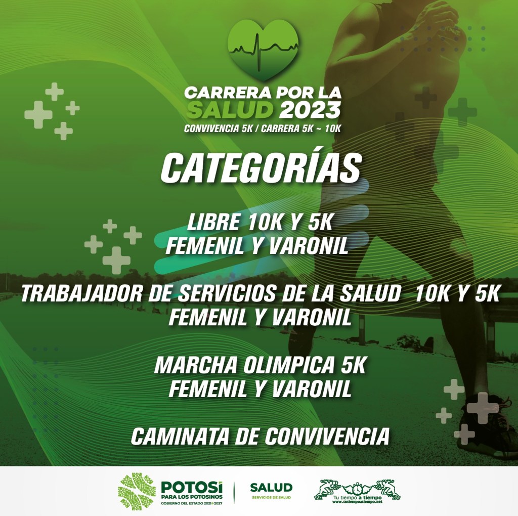 Con el objetivo de fomentar estilos de vida saludable en la población potosina, los Servicios de Salud están convocando a participar el próximo 15 de octubre en la Carrera por la Salud, en la que quienes participen podrán correr categoría libre de 10 y 5 kilómetros, marcha olímpica de 5 kilómetros y caminata de convivencia.