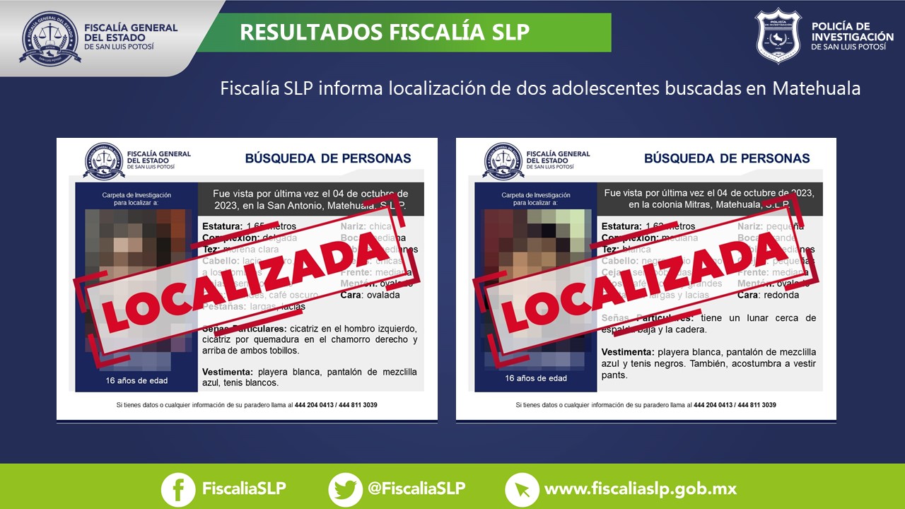La Fiscalía General del Estado de San Luis Potosí (FGESLP) informa sobre la localización de dos adolescentes que eran buscadas en Matehuala a partir de ayer, 4 de octubre de 2023.