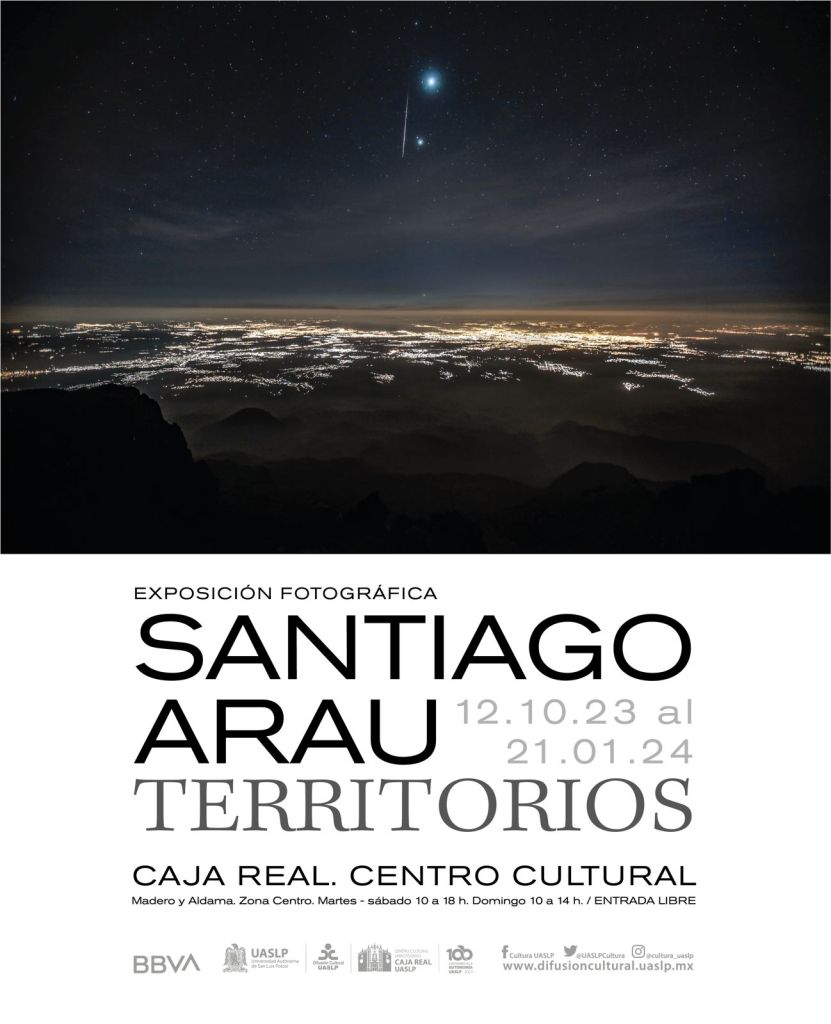 La Universidad Autónoma de San Luis Potosí a través de la Secretaría de Difusión Cultural, en conjunto con BBVA México presentan “Territorios”, exposición fotográfica del artista mexicano Santiago Arau y que estará disponible en el Centro Cultural Universitario Caja Real, del 12 de octubre de 2023 al 21 de enero de 2024.