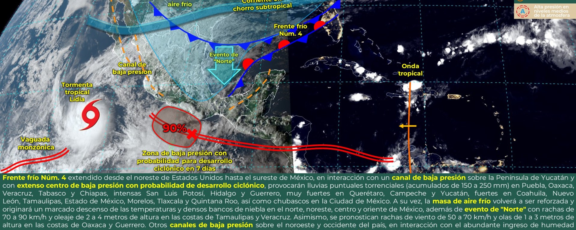 Lluvias intensas con puntuales torrenciales (150 a 250 mm): Guerrero, Oaxaca, Puebla, Veracruz, Chiapas y Tabasco.