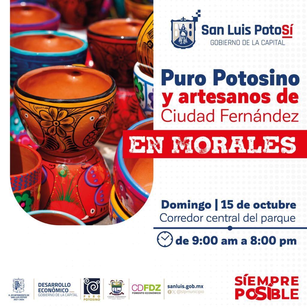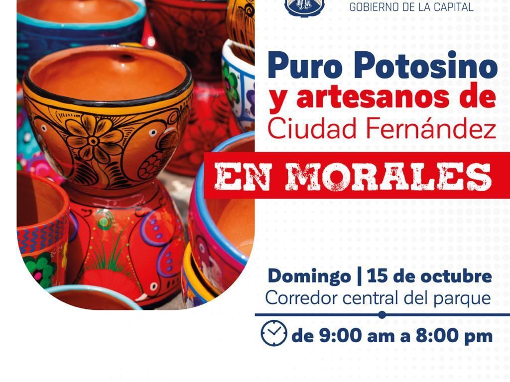 El próximo domingo 15 de octubre en el Parque de Morales se llevará a cabo la exposición de Puro Potosino, en asociación con artesanos de Ciudad Fernández, con la finalidad de promocionar productos de ambos municipios.