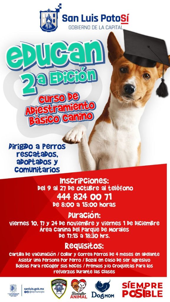 El curso se realizará los viernes 10, 17 y 24 de noviembre, así como el 1 de diciembre de 2023, de 17:15 a 18:30 horas en el área canina del Parque de Morales “Juan H. Sánchez”. Las inscripciones están abiertas desde este lunes 9 de octubre y hasta el 27 del mismo mes en el teléfono 4448-24-00-71, de 8:00 a 15:00 horas.