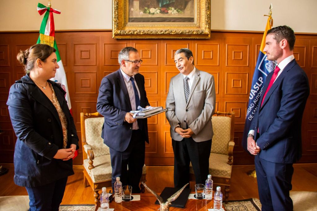 Con la finalidad de estrechar las alianzas de colaboración académica entre universidades en Francia y la Universidad Autónoma de San Luis Potosí, el doctor Alejandro Javier Zermeño Guerra, rector de la Institución, recibió en sus oficinas de Rectoría en el Edificio Central, la visita del Cónsul General de Francia, el señor Vincent Perrin, quien estuvo acompañado por el doctor Benjamín Rontard, Cónsul Honorario de Francia en San Luis Potosí.