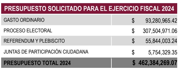 El proyecto de presupuesto de egresos del organismo electoral solicitado para el ejercicio fiscal 2024 que incluye los rubros de gasto ordinario por 93 millones, 280 mil 965 pesos; Proceso Electoral 2024 por 307 millones, 504 mil 971 pesos; Referéndum y Plebiscito por 55 millones, 844 mil, 003 pesos y Juntas de Participación Ciudadana por 5 millones, 754 mil, 329 pesos, haciendo un presupuesto total de 462 millones, 384 mil, 269 pesos.