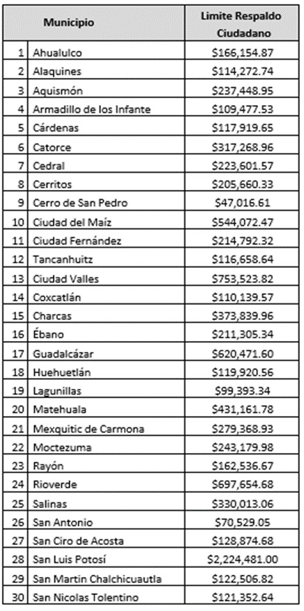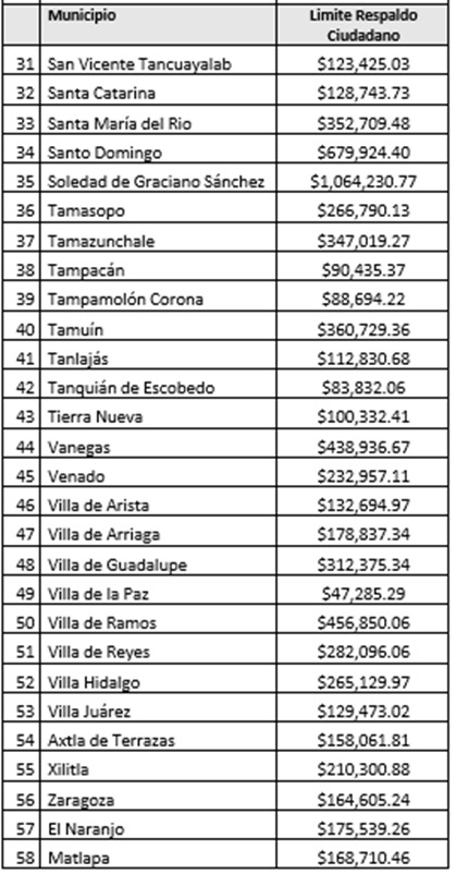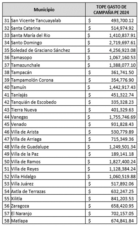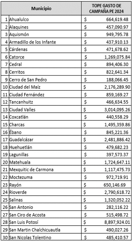 En cuanto al límite máximo de gasto de campaña para los 58 Ayuntamientos, del estado de San Luis Potosí, se toman en cuenta elementos como los electores inscritos en el padrón electoral, la extensión territorial, el número de secciones electorales y la densidad poblacional, mediante el ejercicio de cálculo realizado el tope es el siguiente para cada municipio: