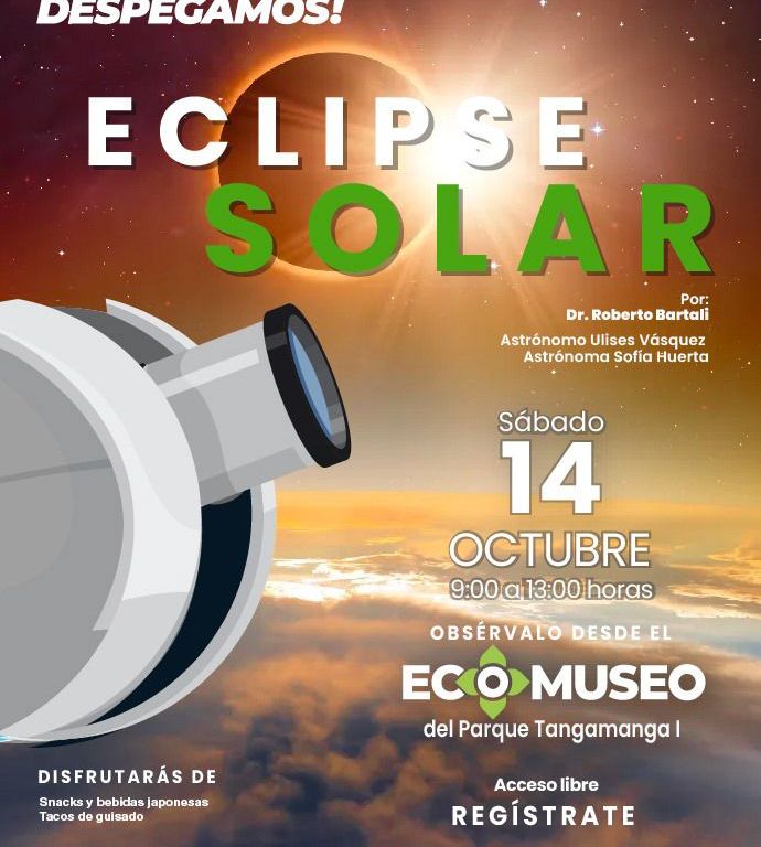 El Gobierno del Estado, a través del Centro Cultural y Recreativo Tangamanga I y II, invita a las familias potosinas a disfrutar de las diferentes actividades al aire libre que se tienen preparadas este sábado durante el eclipse solar, para que puedan disfrutar de este fenómeno astronómico de manera segura con el apoyo de especialistas.