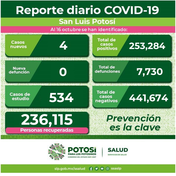 Este día se presentan cuatro nuevos casos de los 253 mil 284 totales registrados en SLP.