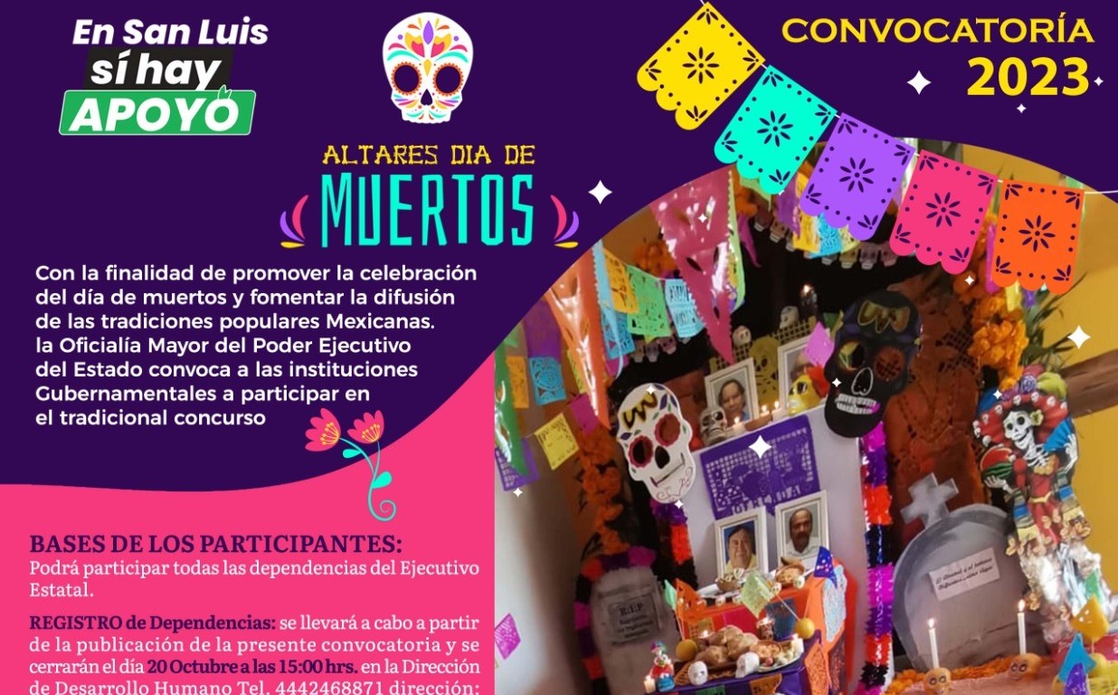 En apoyo al fomento y la preservación de las tradiciones potosinas y mexicanas, la Oficialía Mayor del Ejecutivo, lanzó la convocatoria dirigida a todas las dependencias de la Administración Pública Estatal para el concurso de elaboración del tradicional “Altar de Muertos”, con la meta de superar el número de las y los servidores públicos que participaron el año pasado a través de las 36 dependencias inscritas.