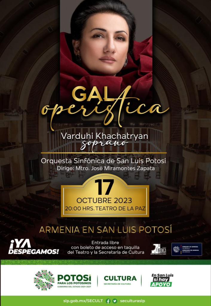 Para seguir estrechando lazos de intercambio cultural entre San Luis Potosí y el país de Armenia, el Gobierno de San Luis Potosí, a través de la Secretaría de Cultura (Secult), presentará este 17 de octubre de 2023, a las 20:00 horas, la espectacular Gala Operística Armenia en San Luis Potosí con la presentación de la mundialmente conocida soprano Varduhi Khachatryan.