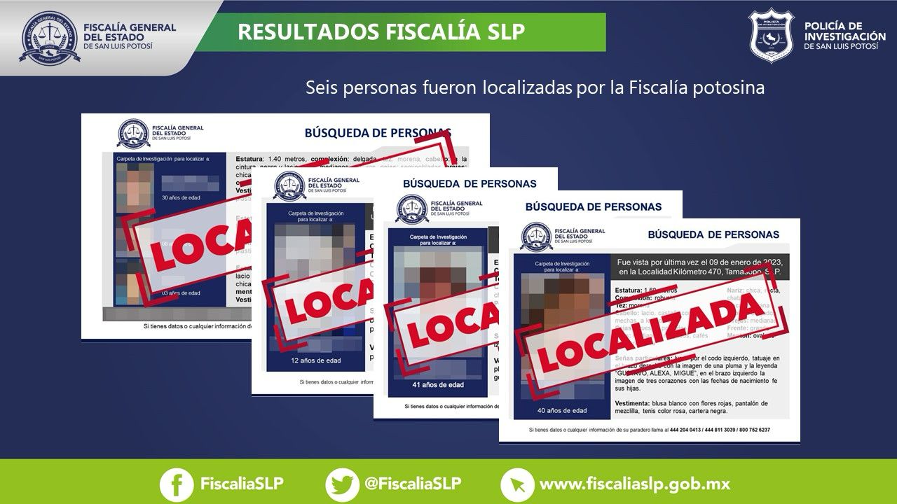 En las últimas horas, la Fiscalía General del Estado de San Luis Potosí (FGESLP) informó sobre la ubicación de seis personas que era buscadas por sus familias en la entidad potosina.