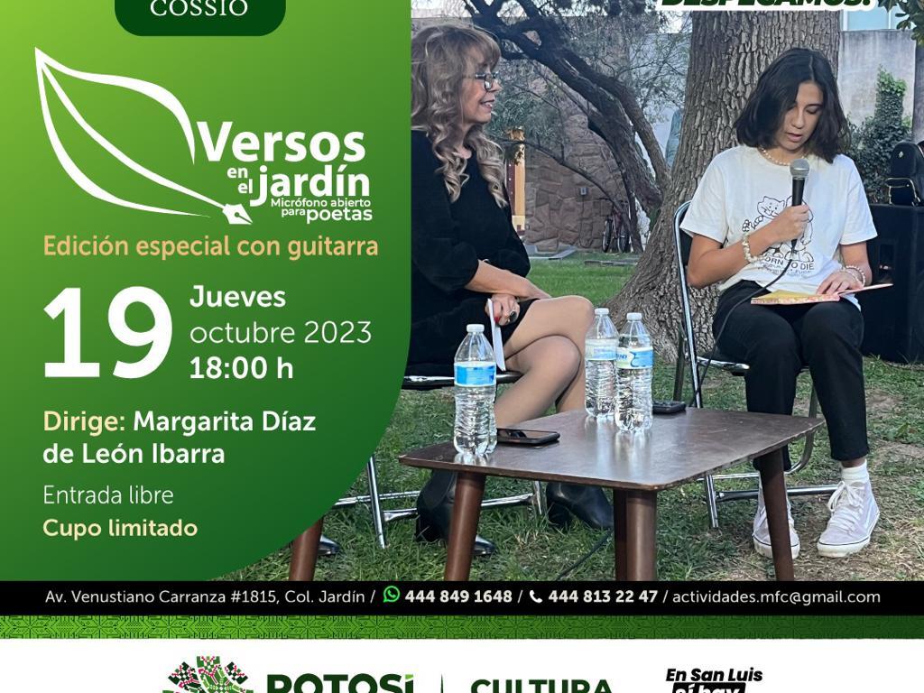 En San Luis Potosí si hay apoyo en cultura y a la promoción de sus diversas expresiones artísticas, por lo que la Secretaría de Cultura de Gobierno del Estado, invita al público a participar en “Versos en el jardín, Micrófono abierto para poetas” que se llevará a cabo este jueves 19 de octubre a las 18:00 h, en el Museo Francisco Cossío, entrada es libre y cupo limitado.