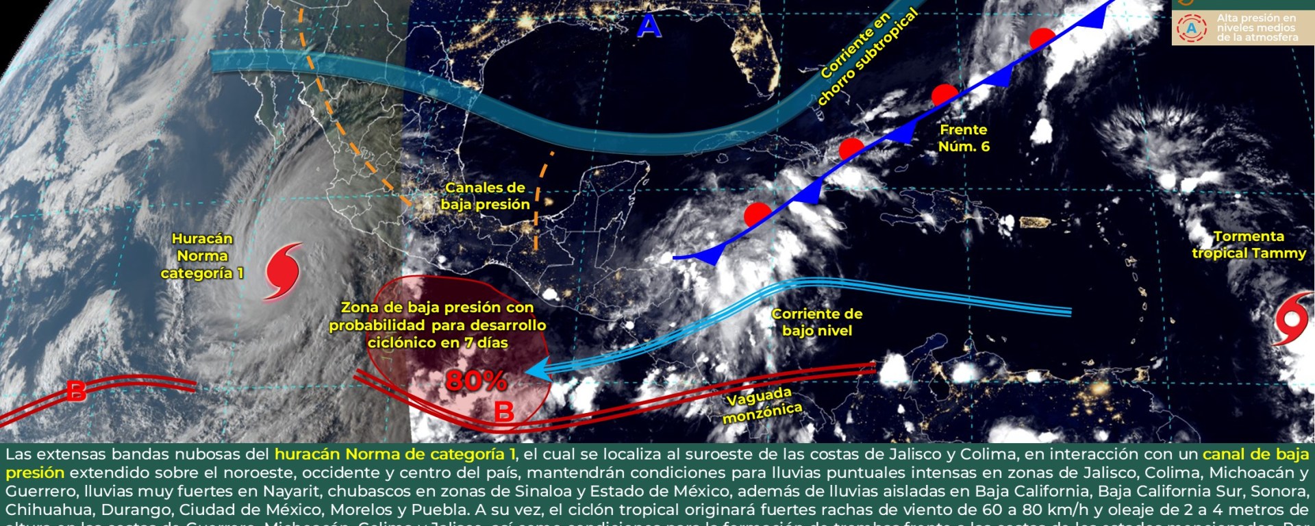 Viento con rachas de 90 a 110 km/h con posible formación de trombas y oleaje de 3 a 5 metros de altura: costas de Jalisco, Colima y Michoacán.