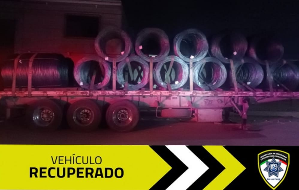 De esta manera, en patrullajes nocturnos, agentes municipales adscritos a la Jefatura regional oriente lograron ubicar en la avenida Porfirio Díaz de la colonia Cuartel Los Aguilares en Villa de Pozos, un remolque blanco marca Fruehauf con la carga de alambron.