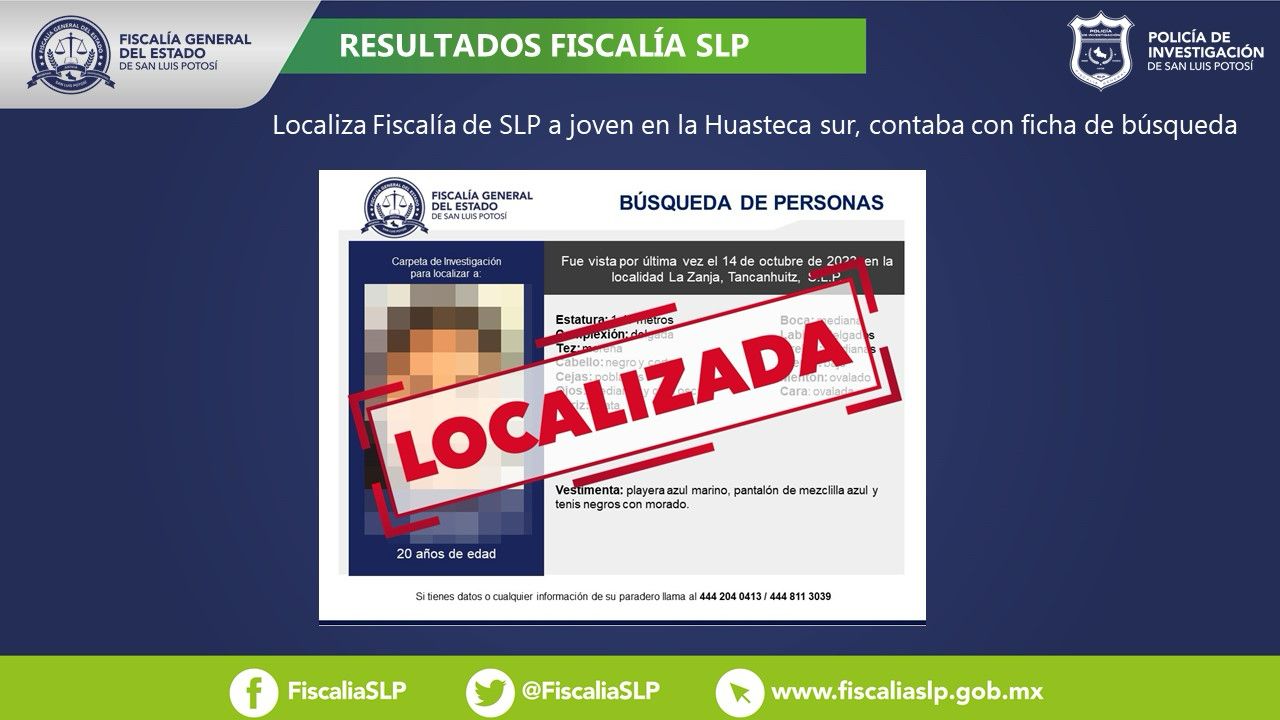 De esta manera, cuando se comprobó la información obtenida, la FGESLP efectúo la desactivación de su ficha de búsqueda emitida en los canales oficiales da la institución.