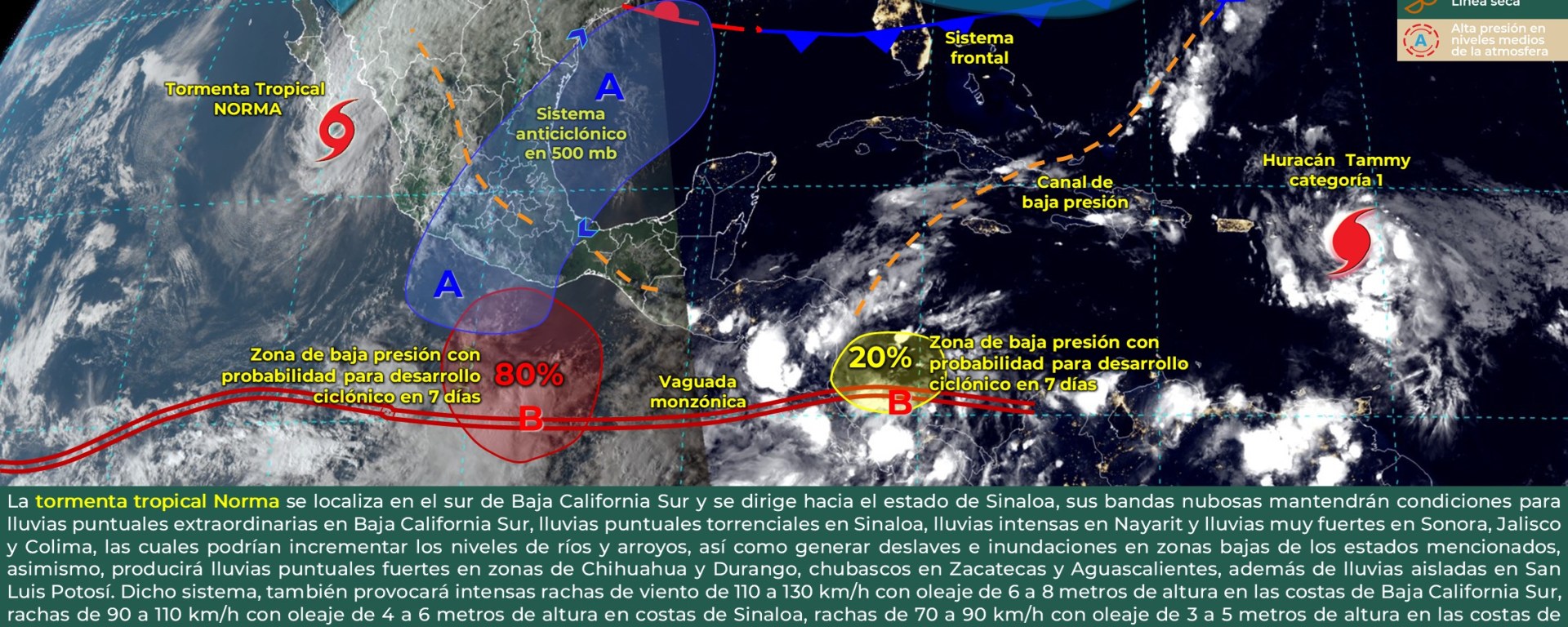 Rachas de viento de 100 a 120 km/h, oleaje de 4 a 6 metros de altura y posible formación de trombas marinas: costas de Baja California Sur y Sinaloa, así como en el sur del Golfo de California.