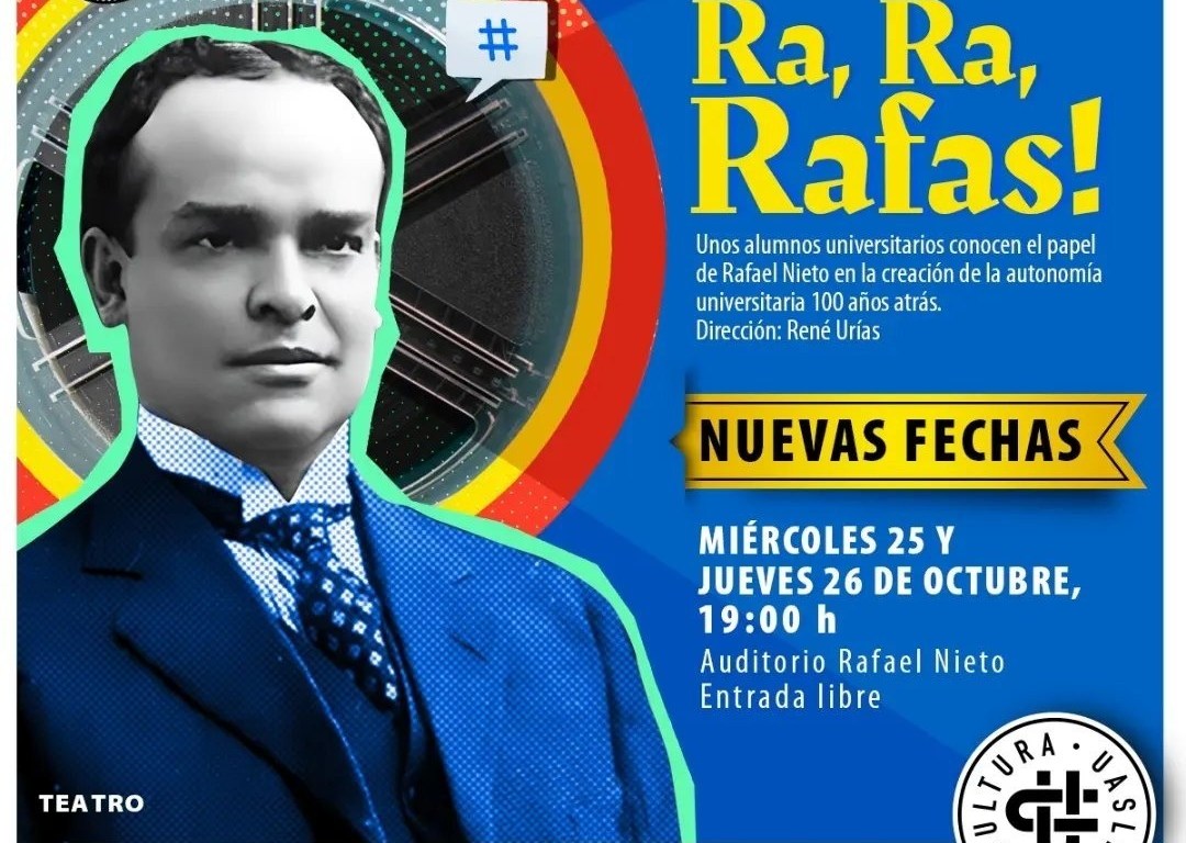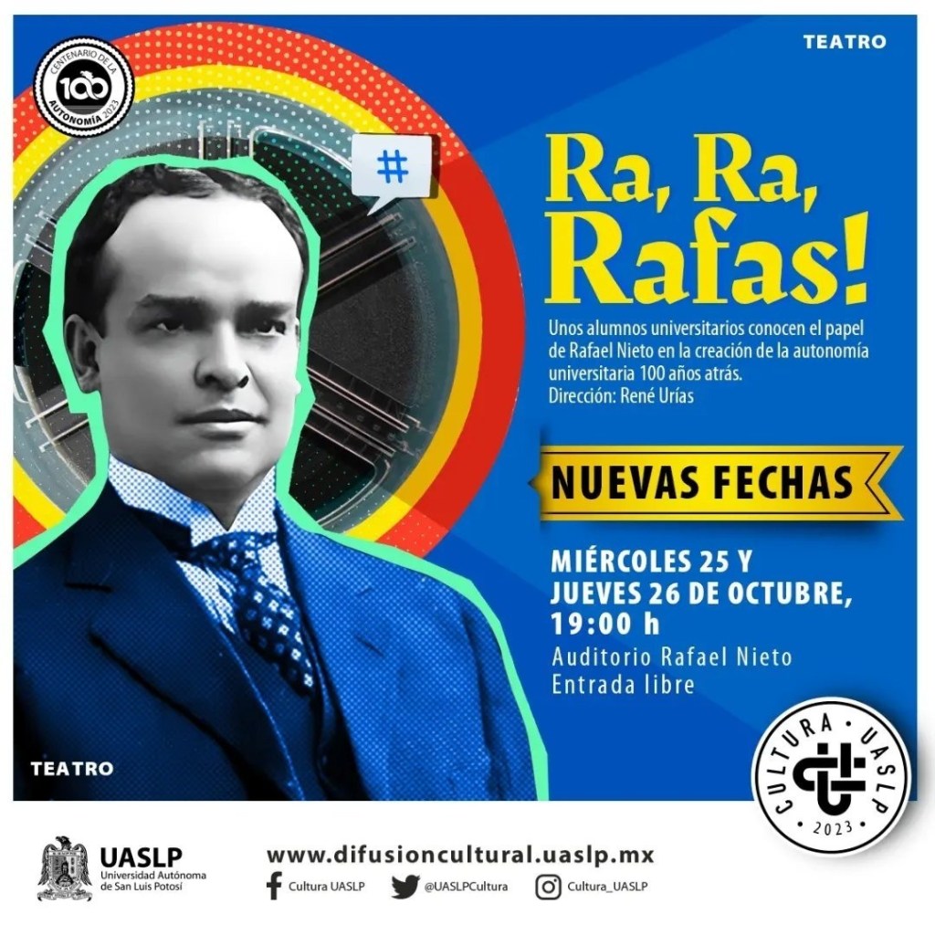 Gracias a la respuesta del público, la puesta en escena “Ra, Ra, Rafas”, abrirá dos fechas más para que la comunidad universitaria y el público en general, puedan disfrutar de esta obra escrita y producida por universitarios. La cita son los días 25 y 26 de octubre de 2023 en el Auditorio “Rafael Nieto”.