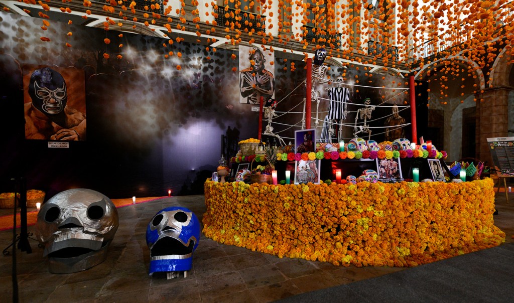 El altar, honra en esta ocasión a la lucha libre mexicana, considerada como patrimonio inmaterial de la cultura popular del país y en su diseño, ofrece en la parte superior un ring y recorre en su base circular cubierta con la característica flor de cempasúchil, imágenes con algunos de los más importantes exponentes de esta disciplina que dejaron huella en los cuadriláteros.