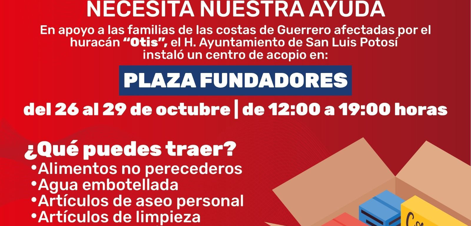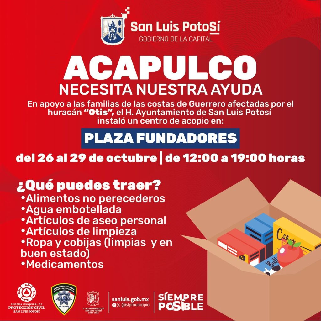 Con el lema «Acapulco necesita nuestra Ayuda», el Gobierno de la Capital hizo un llamado a todos los potosinos para que aporten lo que puedan, con el fin de ayudar a quienes carecen de lo más indispensable, como son alimentos, agua potable, ropa, medicinas y otros enseres.