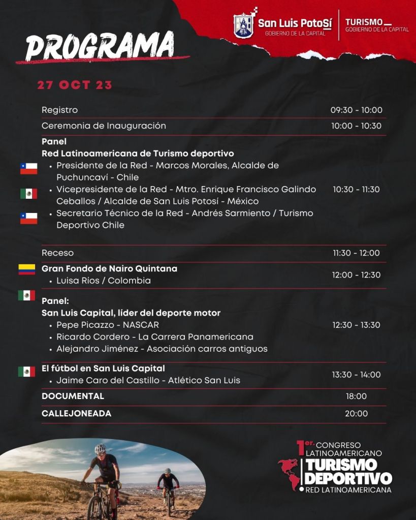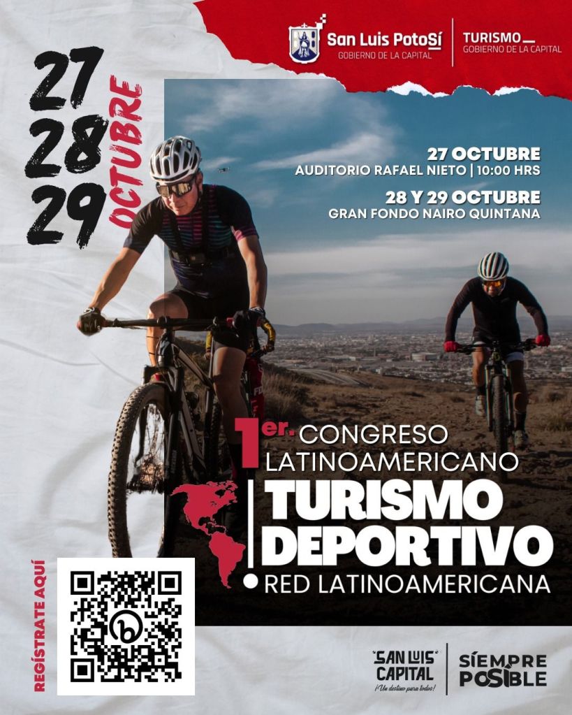 De manera simultánea al magno evento ciclista Gran Fondo Nairo Quintana, San Luis Potosí será sede del Primer Congreso Latinoamericano de Turismo Deportivo, del 27 al 29 de octubre, en el que destacadas personalidades en diferentes ámbitos del deporte y expertos en eventos del más alto nivel, participarán en páneles, conferencias y talleres que nuevamente darán proyección internacional a la Capital potosina.