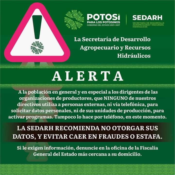 La Secretaría de Desarrollo Agropecuario y Recursos Hidráulicos (Sedarh), alerta a las y los productores del campo, sobre falsos gestores de maquinaria y tractores, quienes piden pagos en efectivo o transferencias bancarias, por lo que, también aclaró que Martín Herrera Santos, Gumaro Nájera Rangel y Alejandro García Aguirre no trabajan en esta dependencia.